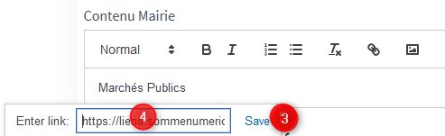 Pour cela, tapez le texte qui deviendra un lien hypertexte (cliquable) dans le Chapo introductif ou le Contenu Mairie (1). Une fois tapé, sélectionnez le texte (2) puis cliquer sur l'icône représentant un maillon (3). Vous pouvez maintenant coller (4) le lien obtenu précédemment dans WeDrop (à l'étape 4, 8 ou 9 du chapitre ci-dessus) puis cliquer sur Save (5) pour créer le lien.