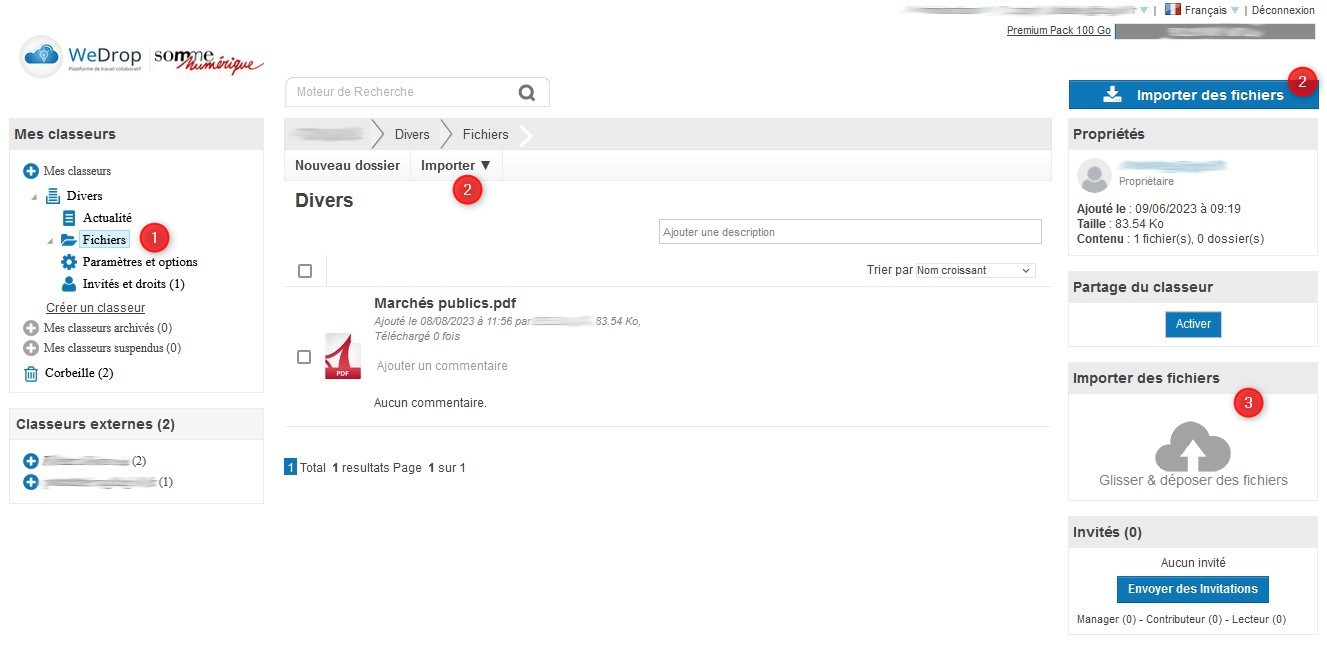 Vous pouvez importer de nouveaux fichiers en cliquant sur Importer des fichiers (2) ou par Glisser/Déposer (3) depuis l'explorateur Windows. Les fichiers importés sont visibles dans la fenêtre centrale.