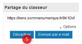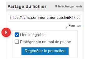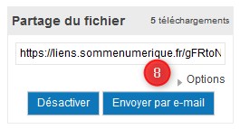 Une fois le partage activé, un lien est généré. Vous pouvez copier ce lien, celui-ci sera ensuite utilisé pour créer un lien de téléchargement sur votre page web. Si ce lien est désactivé (commande Désactiver (5) sous le lien généré), le téléchargement ne sera plus possible.