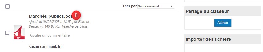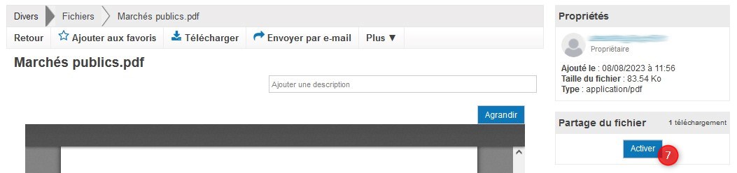 Après avoir cliqué sur le nom du fichier à partager, un aperçu sera affiché (dans l'exemple ci-contre, un fichier PDF). Dans la colonne de droite, vous pouvez activer (7) le partage du fichier.